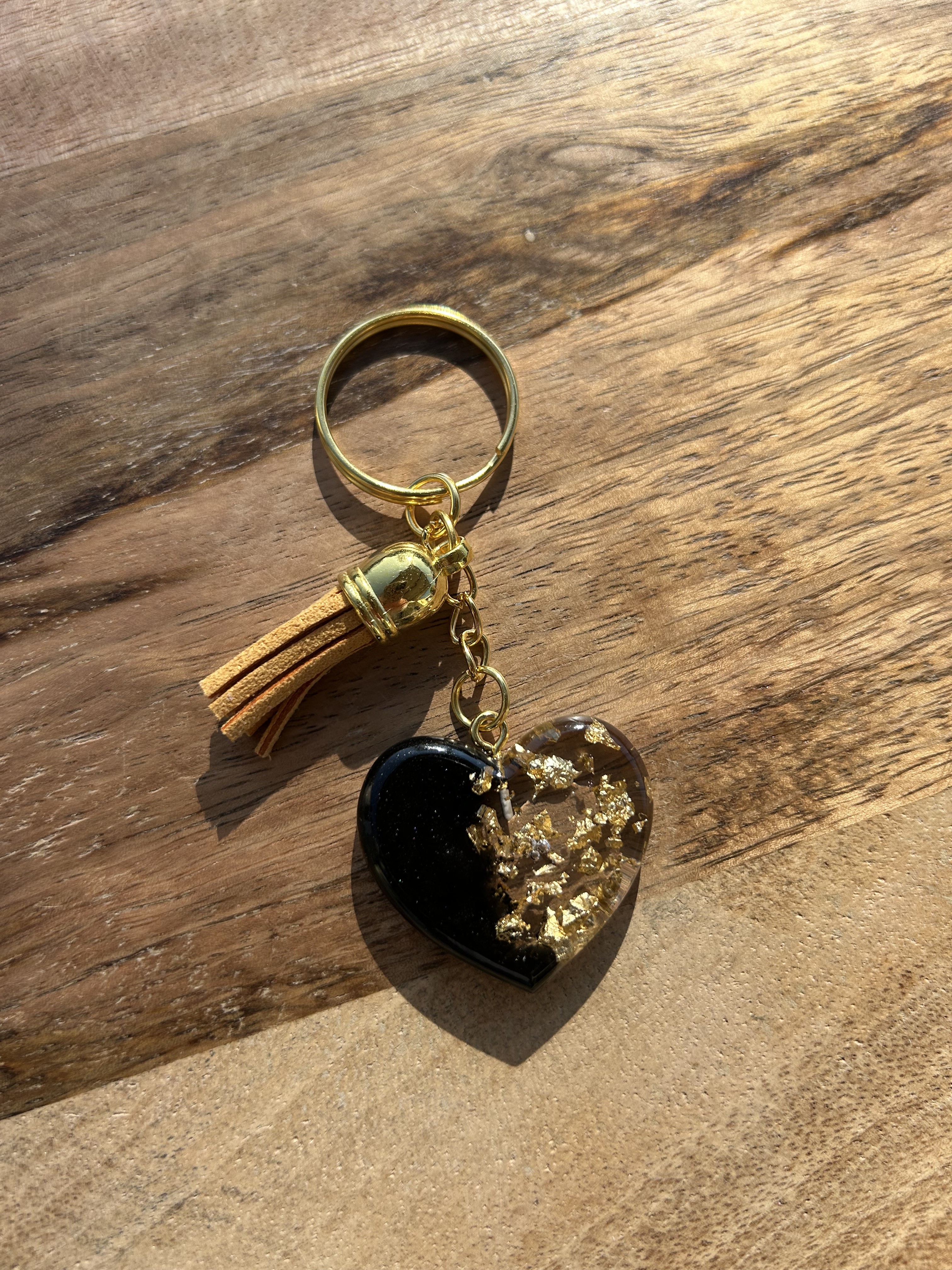 Porte-clés en forme de cœur, réalisé à la main en résine époxy. Chaque modèle est unique, avec ses effets de couleur, paillettes ou feuilles dorées.