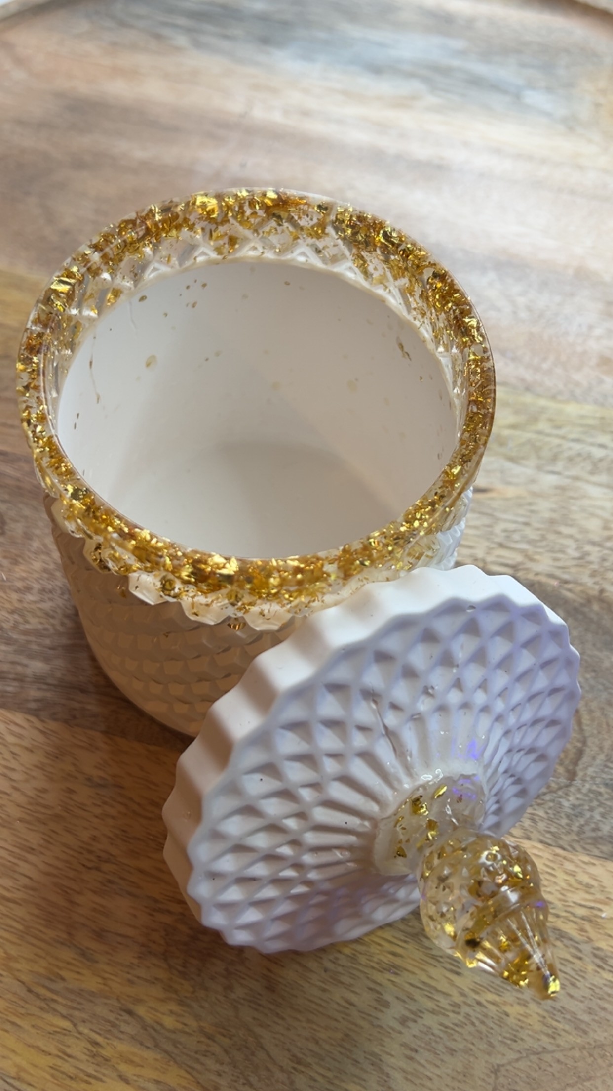 Jolie boîte en résine plâtre, réalisée avec soin, au design texturé et délicatement rehaussée de feuilles dorées. Son couvercle assorti apporte une finition élégante et raffinée. Idéale pour ranger bijoux, petits trésors ou simplement comme objet décoratif, elle trouvera parfaitement sa place sur une coiffeuse, une étagère ou une table de nuit. Pièce unique, à la fois chic et intemporelle.