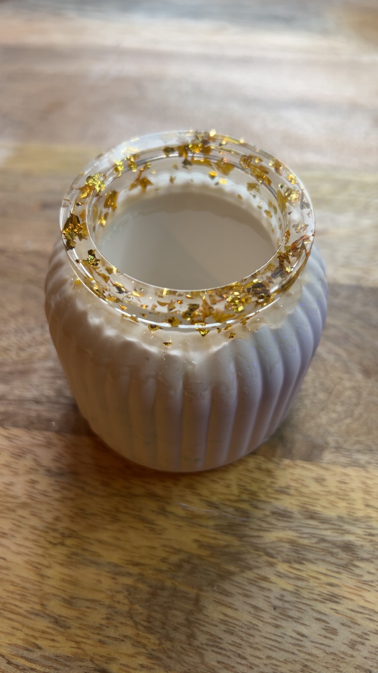 Joli petit vase en résine plâtre, au design nervuré et aux finitions élégantes. Son col transparent incrusté de feuilles dorées apporte une touche chic et lumineuse. Parfait pour accueillir des fleurs séchées, une petite composition ou être exposé seul comme objet décoratif. Idéal pour une ambiance douce, raffinée et contemporaine. Pièce réalisée avec soin, unique et pleine de charme.